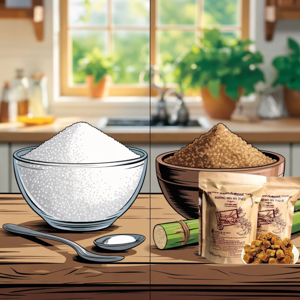 Sự khác nhau thứ hai nằm ở mức độ chế biến và cách nhìn nhận. Đường tinh luyện đại diện cho nhóm thực phẩm ngọt phổ biến trong đời sống hiện đại, thường xuất hiện trong bánh kẹo, nước ngọt và thực phẩm chế biến sẵn. Còn đường mía hà thủ ô lại được nhiều người xem như một sản phẩm có tính chất riêng, gắn với hướng sử dụng gần hơn với thực dưỡng hoặc hỗ trợ sức khỏe. Chính điều này tạo ra cách tiếp cận rất khác giữa hai loại.